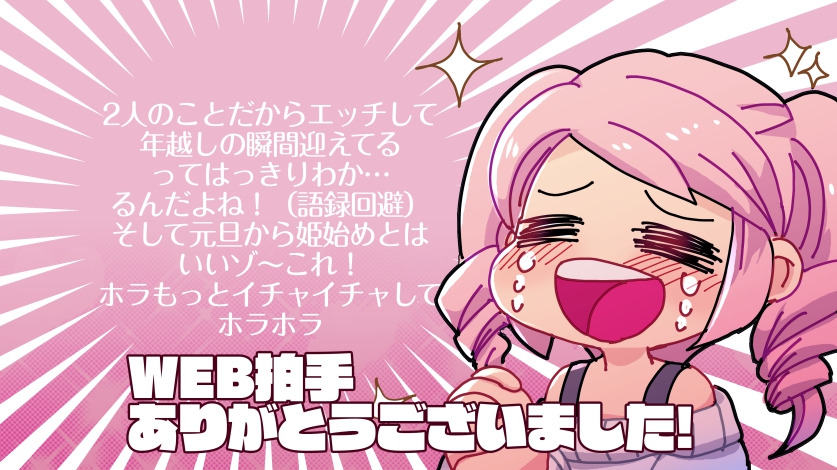 WEB拍手ありがとうございました! いつも拍手ありがとうございまーす! コメントなしで拍手くれた方もありがとうございました! >>2026年4月5日(日) に投稿くださった方 クリックorタップして返信表示 やっぱり回避できてないじゃないか(呆れ) 今年は年始のカウントダウンライブをヌラネバセブンでやっていたので、 そのあとに姫はじめしてたんだろうなと思っています(体力お化け) ここ最近シオカラ百合かけてないのでもっと描きたいですね! ━ SNSやってます ━ Pixiv Tumblr Twitter ━ Navigation ━ WEB拍手返信 最近の更新 TOPへ 押してくれたらめっちゃ嬉しいfavoriteいいね!(sign_languageWEB拍手)送信中です×※コメントは最大500文字、5回まで送信できます送信送信中です送信しました!