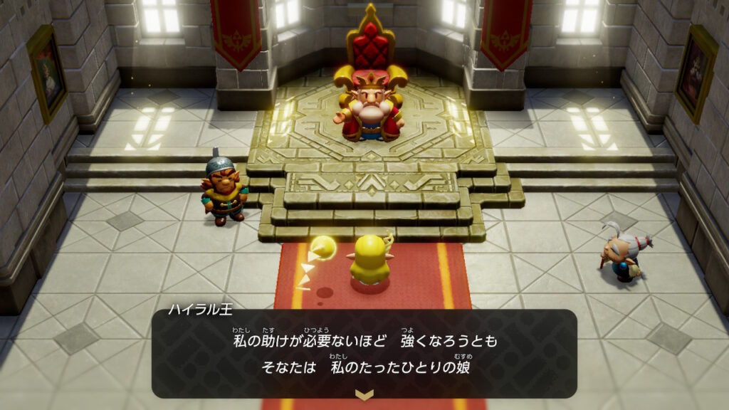 中でも道中のイベントで、町の子供が幸せの四つ葉のクローバーをゼルダ姫経由でハイラル王へ渡すイベントは大変心が温かくなりました。民の父娘を通して描写されるハイラル王父娘の愛。今作のハイラル王は歴代で一番娘思いだというところもよく伝わってきました。きちんと部下に的確に指示も出せて優秀だし、国民を無下に扱うこともしないし、娘を危険な目には合わせたくないけど、国のために泣く泣く戦いに出すという葛藤も見て取れますし、ハイラル王にすごい好感がもてる作り。